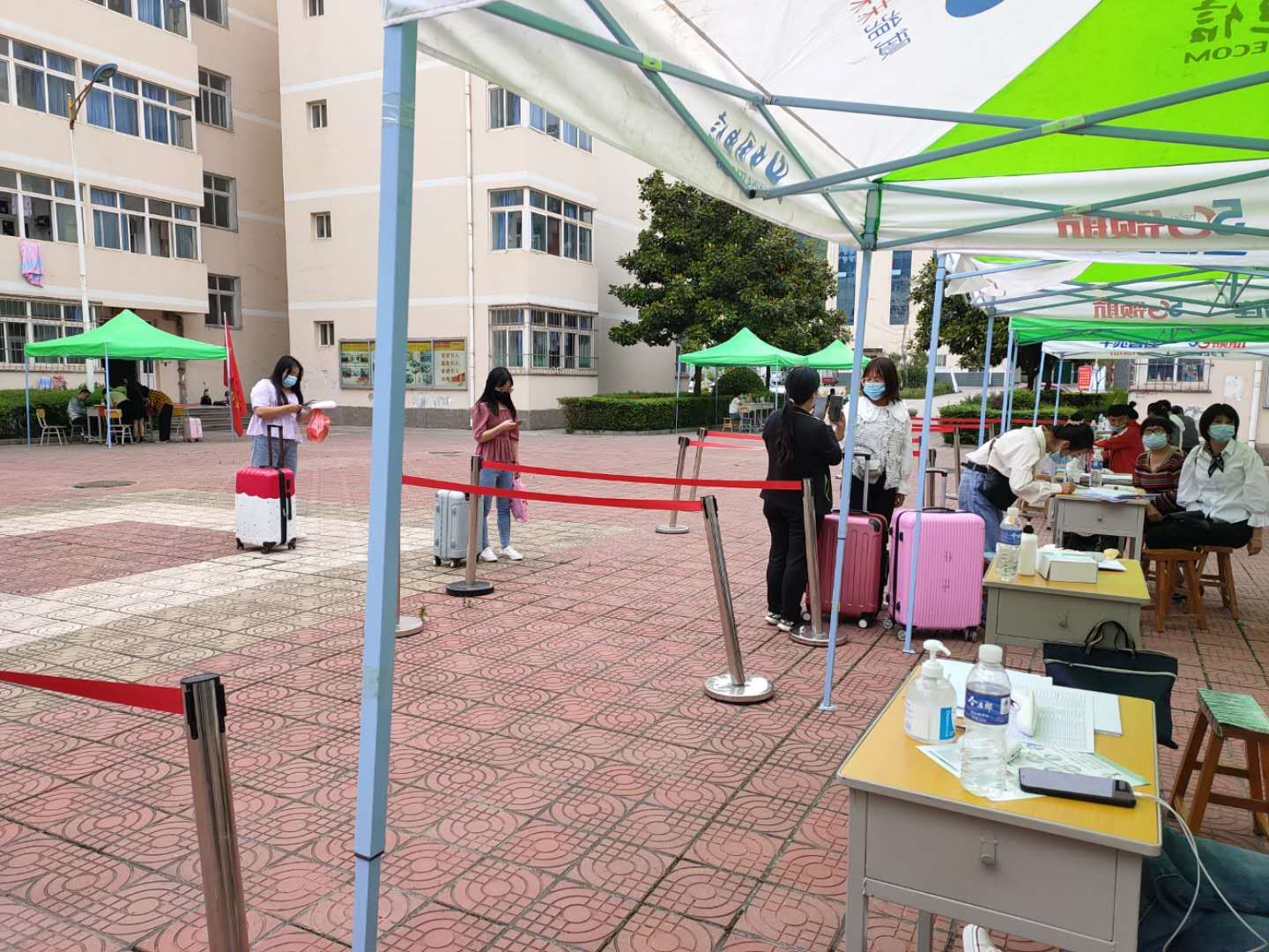 按照公司统一部署,威廉体育官方网站2017级员工2月20日返校复课。一大早,公司20位负责迎接员工的教师整整齐齐在女生三号公寓前准备好了报到注册表、测温枪、消毒工具、洗手液,顶着烈日以饱满的热情等待员工们返校。