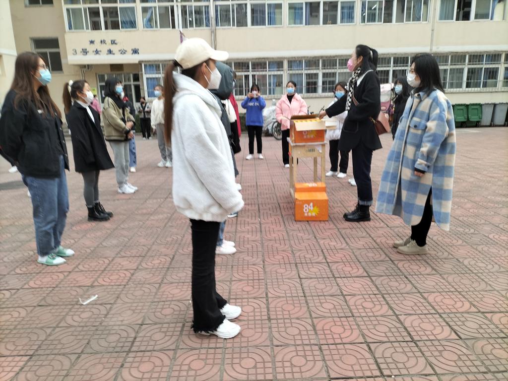 号公寓楼下集合活动依次展开,由朱燕书记,苏红宇等老师组织大家对优秀宿舍进行了颁奖活动。在活动过程中,由相关人员组织同学们按公寓号排好队,两个人之间相距一米的距离,依次按顺序领取,由部门相关人员进行拍照记录,在此期间大一新生与相关人员积极配合,致使这次活动圆满落幕。