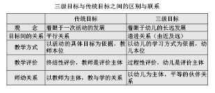 实践中,三级目标是如何运用的?又是如何支持幼儿的主动学习,支持教师的自主成长呢?下面我们通过一组对比来比较三级目标与传统目标的区别和联系(见下表)。
