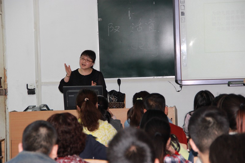 4月23日上午,兰州大学教授、邓红博士应邀来威廉体育官方网站讲学。 早上8:30,在威廉体育官方网站107多功能教室,邓教授就《甘肃省幼儿园教育指导刚要(试行)》进行全面解读。首先邓教授对刚要制定的背景与意义进行了总结,刚要的制定即是国家中长期教育改革和发展战略目标的需要,更是促进每个幼儿在不同水平上更好的成长,促进每个幼儿有个性的发展,有利于全面促进甘肃幼教事业的整体水平;其次邓红教授详细阐释了幼儿教育的基本原则:尊重与关爱的原则、可持续发展的原则、保教并重的原则、游戏为主的原则、整体教育的原则、环境创设的原则、因地制宜的原则。最后她全面阐释了幼儿园教育的健康、语言、社会、科学、艺术等五大领域及其关系,从不同的角度促进幼儿情感、态度、能力、知识、技能等方面的发展做了精彩的分析。