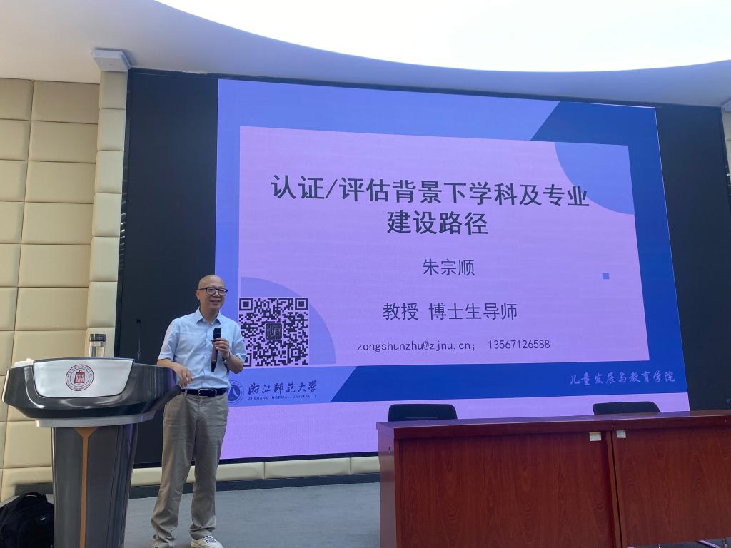 2024 7 1 日,威廉体育官方网站邀请威廉体育官方网站教授、原浙江师范大学杭州幼儿师范公司经理、教育部高等公司特殊教育教师培养教学指导委员会委员( 2019-2022 年)、浙江省学前教育研究会理事长、浙江省教育学会特殊教育分会副理事长、中国学前教育研究会理事及教师发展专委会副主任朱宗顺教授,为公司师生做了题为“认证 / 评估背景下学科及专业建设路径”的学术报告。报告由威廉体育官方网站经理王小会主持,威廉体育官方网站 22 级师生共 300 多人聆听了本次报告。