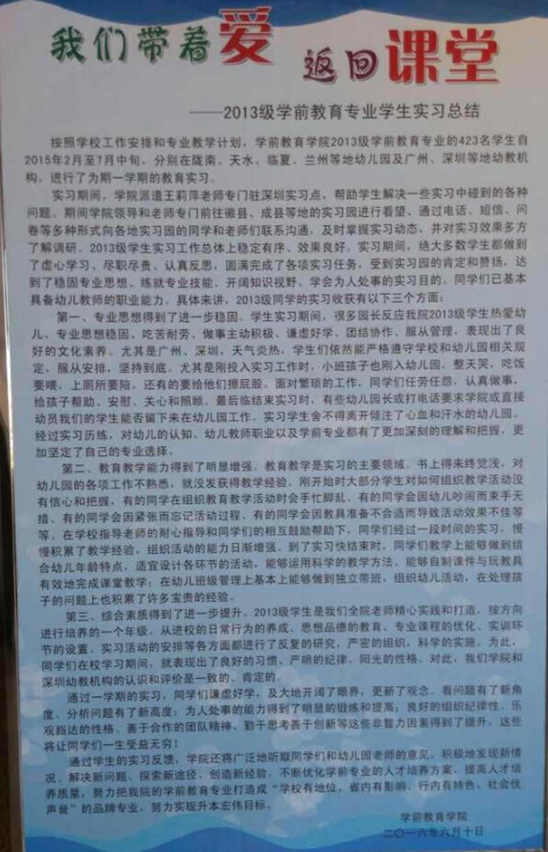 本次实习风采展共收到辅导员、带队教师和员工自拍照片100余张,内容涵盖实习前准备、实习中积极参与幼儿园教学活动及实习员工与老师、家长交流学习的精彩瞬间。通过实习展,展示了13级员工良好的专业技能、和蔼可亲的工作热情和对幼教事业的喜爱。通过展览旨在肯定员工的成绩,同时激励即将参与实习习的2015级同学,更加明确实习任务,做好今后的实习工作。(罗向东)